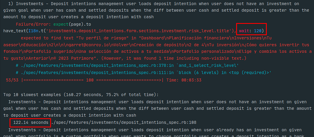 These two last cases modify the default time inculded in configuration file. This does not remove all failures, but it improves legibility. And you can check in tests logs if test is failing by a timeout or antother reason. Happy coding!!!