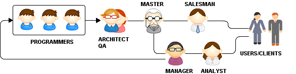 The pairs Master-Commercial, Architect-Quality, Analyst-Manager can be adopted as three roles. It depends on the number of persons in the equipment and how you want to do the things.