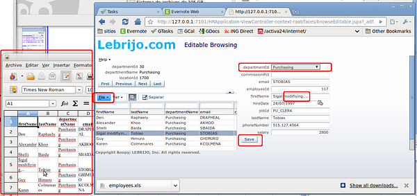 Save, and with right button select "Run" to test the browseEditable.jspx. We can see how: