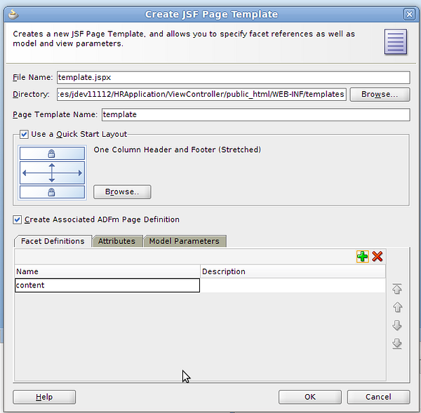 En el proyecto ViewController New > Web Tier > JSF Page Template, creamos /WEB-INF/templates/template.jspx: