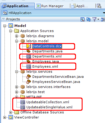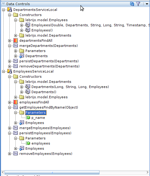 Todos son ficheros XML que lo que hacen es mapear los métodos y beans involucrados en los servicios que quieras consumir desde la vista. Sirve para que el IDE fije los elementos que tiene en la lógica de negocio, y el desarrollador simplemente arrastrando desde la ventana "Data Controls" cree los componentes de la vista sobre el lienzo: