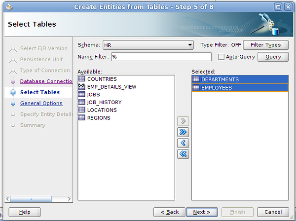 Sobre el proyecto en el menú contextual, New > EJB > Entities From Tables. Vamos a utilizar la tecnología EJB 3.0, anotando los beans de entidad como JPA 2.0: