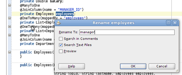 En los dos beans refactorizaré el atributo employees por manager, ya que define más claramente la relación.