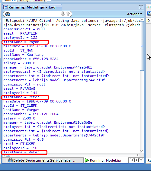 Al hacer Run con el menú contextual sobre el EmployeesServiceBean, se arrancará Weblogic desplegando la aplicación. Y haciendo 'Run' con EmployeesServiceClient, se ejecutará la prueba: mostrará en el log del servidor de Weblogic los empleados que empiezan por P: