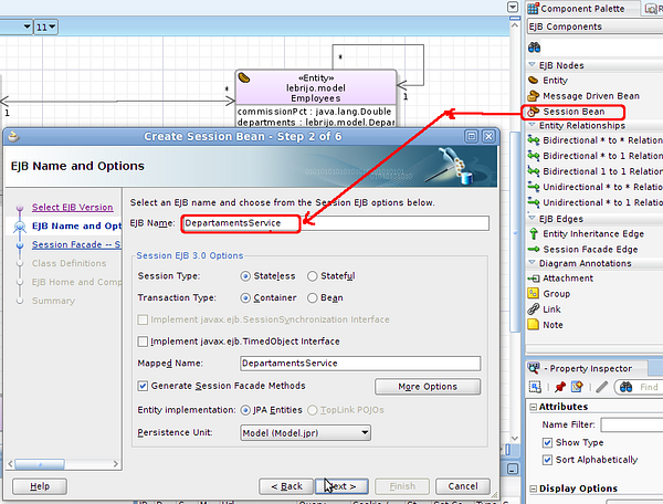 In the EJB diagram created before, we just drag the Session Bean from the palette, to begin the wizard to create the bean: