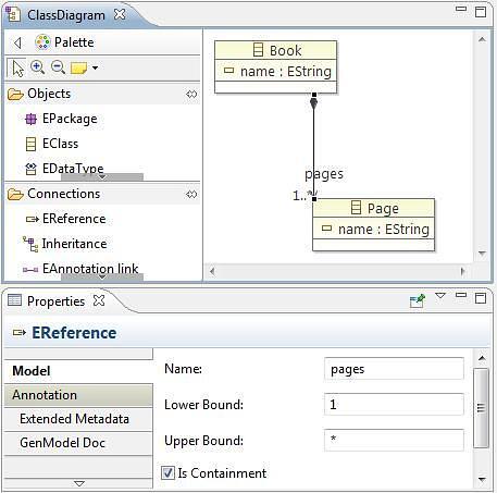 Es muy intuitivo dibujar el diagrama. En la vista properties de la asociación introducimos la cardinalidad y marcamos "Is Containment" para hacer que sea de composición.