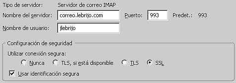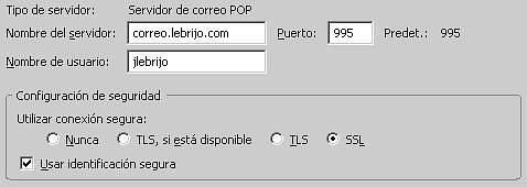 Servidor pop, aquí la conexión SSL, a si como user/pswd son necesarios:
