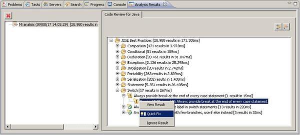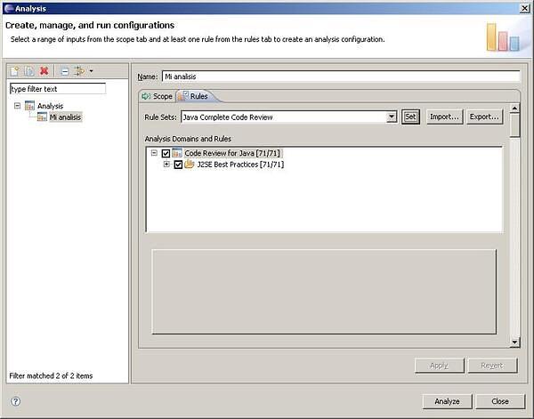Desde el menú superior accedemos a Run > Analysis..., y creamos un análisis, seleccionando el conjunto de reglas que vienen por defecto para analizar "J2SE Best Practices":